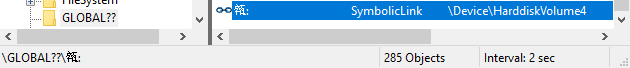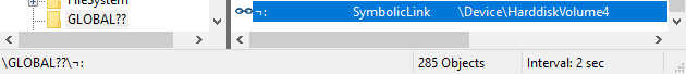 The important thing here, though, is that \??\C:\foo is just one way of referring to the device path \Device\HarddiskVolume4\foo. For example, volumes will also get a named object created using their GUID with the format Volume{18123456-abcd-efab-cdef-1234abcdabcd} that is also a symlink to something like \Device\HarddiskVolume4, so a path like \??\Volume{18123456-abcd-efab-cdef-1234abcdabcd}\foo is effectively equivalent to \??\C:\foo.